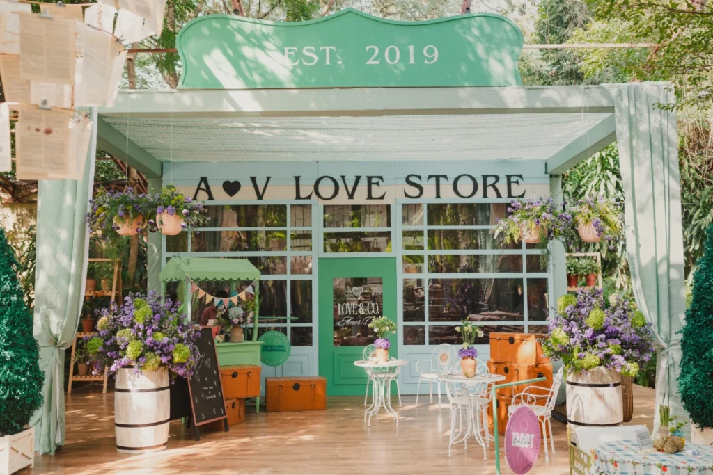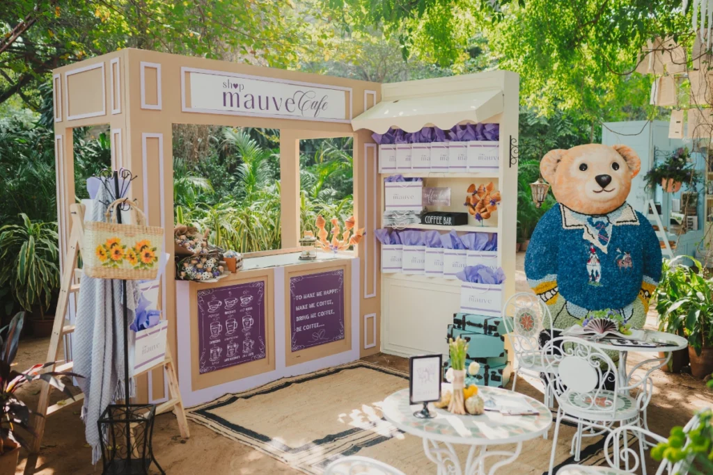 One of the standout moments was a Borough Market-inspired brunch, conceptualised as a large-scale experiential environment reflecting the aesthetic language of the bride’s brand, ShopMauve. Through curated stalls, retail-inspired styling and layered design elements, the brunch translated the brand’s visual identity into a dynamic, celebratory space.