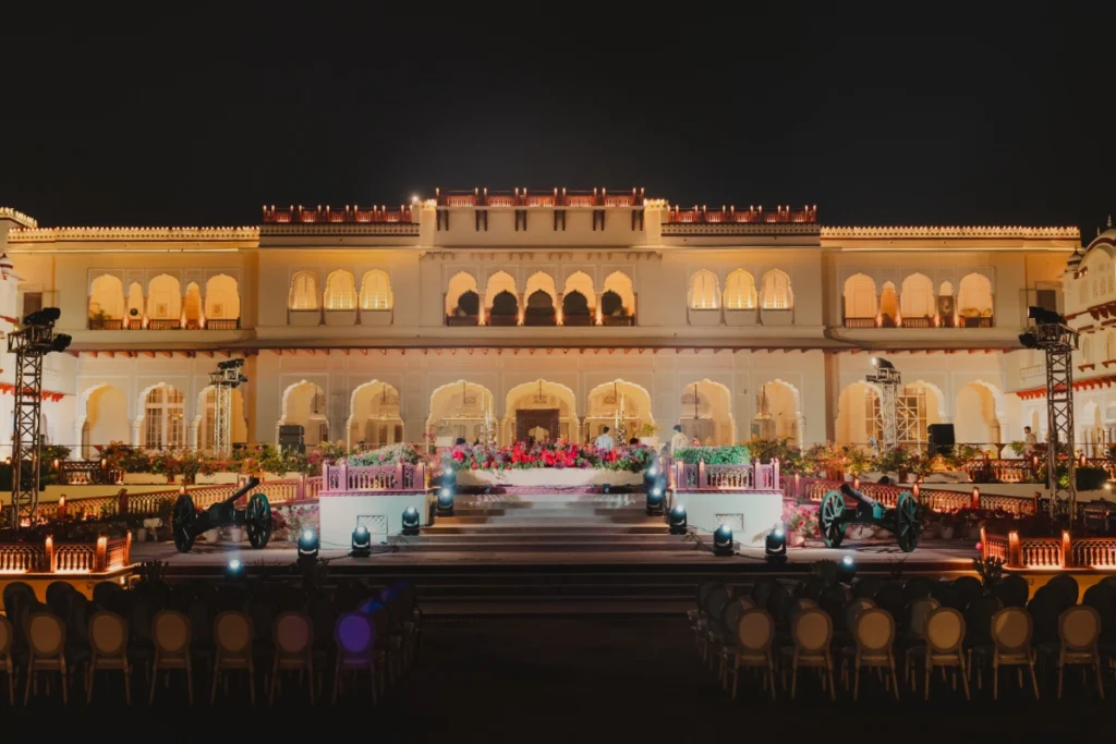The Varmala ceremony at Rambagh Palace embraced architectural scale and grandeur while maintaining emotional intimacy, using the palace’s regal setting to create a visually dramatic yet meaningful moment for the couple.