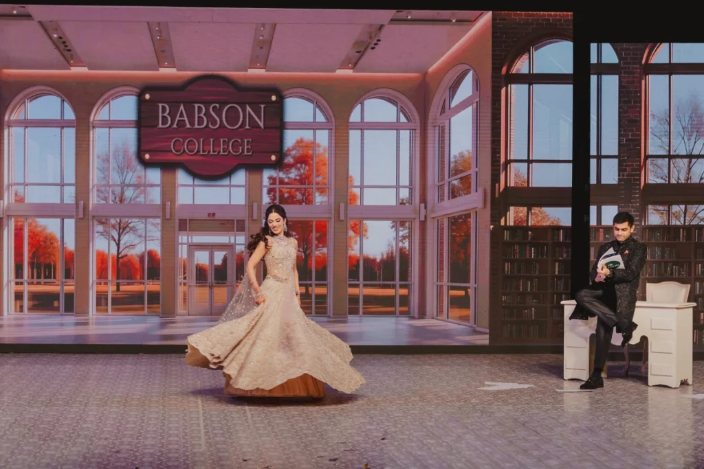 The Sangeet evening unfolded as a narrative performance inspired by Babson College, where the couple first met. Designed as a cinematic “premiere” of their love story, the programme structured performances as chapters reflecting milestones, friendships and shared memories, creating an immersive storytelling format rather than a traditional sequence of acts.